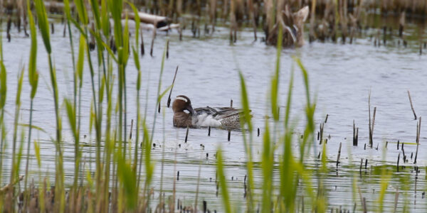 Very occasionally in spring and autumn, the only summer migratory duck to the UK, Garganey, drops in on The Levels…