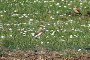 The local Starling celebrity – a pure white one – was spotted, and two Kestrels came down into a field. As we neared the Ferring Country Centre Clive & David led us slightly to the west to overlook some paddocks, where some newly arrived resplendent Wheatears were feeding. Were they “Greenland” ones? While watching these a Willow Warbler sang just behind us.